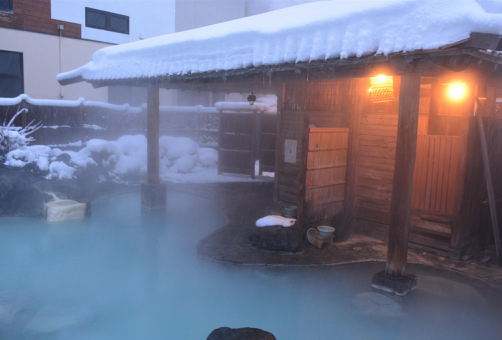 まっ白の雪がこんもりと積もっている様子を眺めながらの露天風呂は