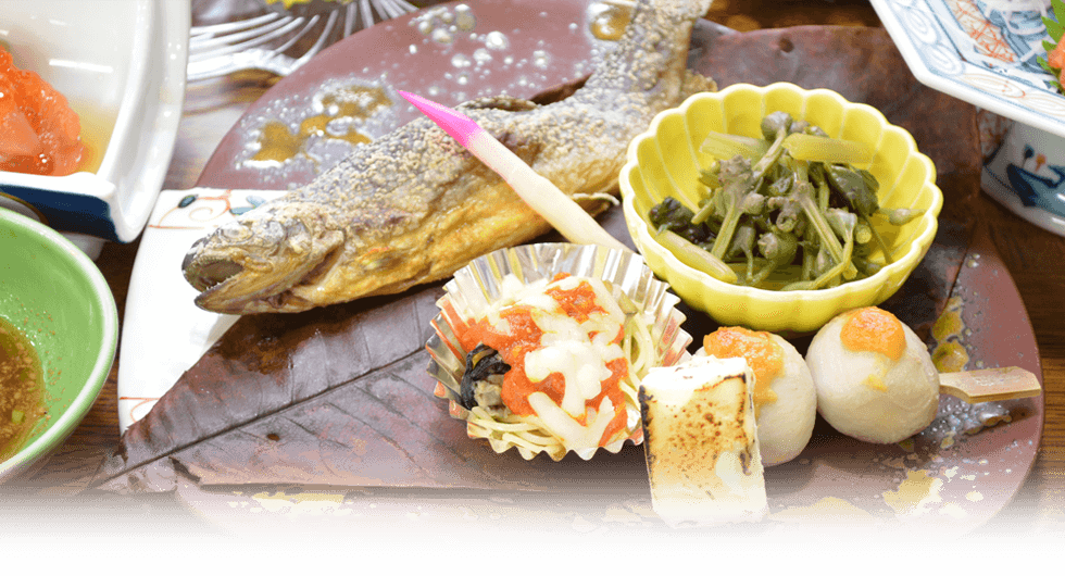 地元の山菜を使った天ぷら(山菜は季節によって変わります)。滋味深い味わいをどうぞ!!